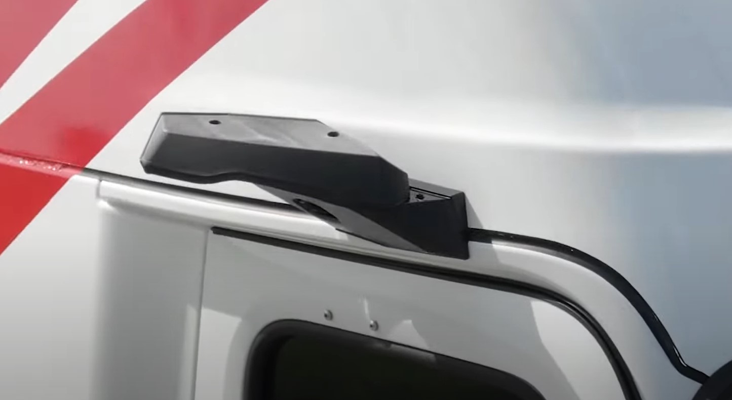 An enhanced field of view when compared to the required rear-vision mirrors. Also, it eliminates blind spots on both sides of the truck and expands the field of view by an estimated 25 percent. Additionally, the trailer panning feature automatically tracks the end of the trailer to keep it in view when the truck is moving forward, potentially eliminating right-hand turn collisions. The system uses high definition cameras and monitors that include features such as color night vision, low light sensitivity and light and glare reduction. MirrorEye has self-cleaning lenses to eliminate problems with rain and dirt, along with a defrosting system for winter driving. MirrorEye is a fail-safe operating system in the event of an individual camera failure, there are 3 cameras per side, others will remain operational. The MirrorEye monitors are mounted inside the cab on the A-pillars and provide drivers with three views – a wide angle, narrow angle and passenger-side “look-down” camera.